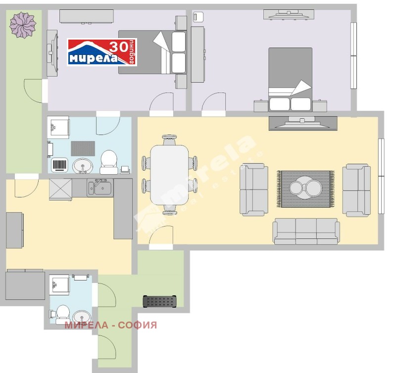 Разпределението включва обширен хол с вестибюл /30.40 кв. м/, с преход към две спални /16 кв. м и 17.50 кв.м/, отделна кухня /10 кв. м/, баня, отделна тоалетна и балкон, извън застроената площ на имота от 80 кв.м.