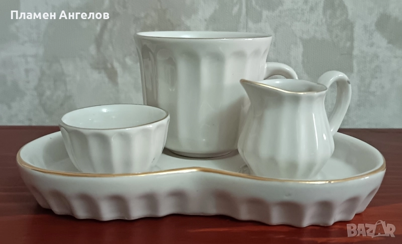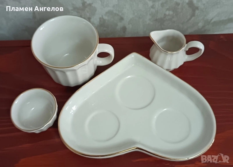 Комплект за кафе във формата на сърце. Съдържащ чаша за кафе, Малка каничка за мляко, съдче за бита сметана или захар и други и основа (подносче сърце). Порцеланов комплект със златен кант, подходящ за романтични моменти, поводи, за поднасяне на сутришно кафе във леглото. Подходящ за сервиране на кафе, капучино, лате, какао. Чисто нов, неопотребяван, абсолютно нов и веднъж не е ползван.