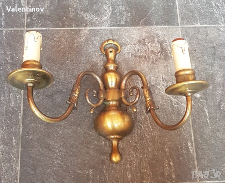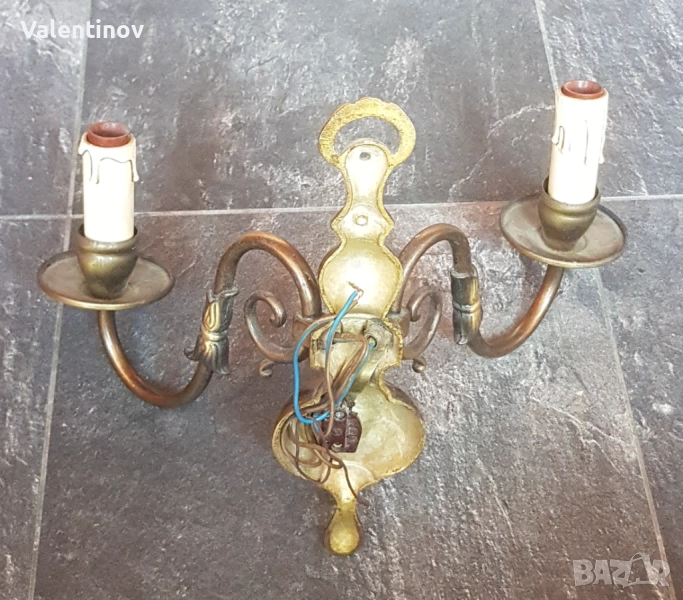 Старинен, бронзов аплик с две рамене, основата е бронз, раменете са от месинг, височина на основата- 27см, разстояние между раменете- 28см, дължина на рамото- 20см. Фасунгите- за крушки миньонки.