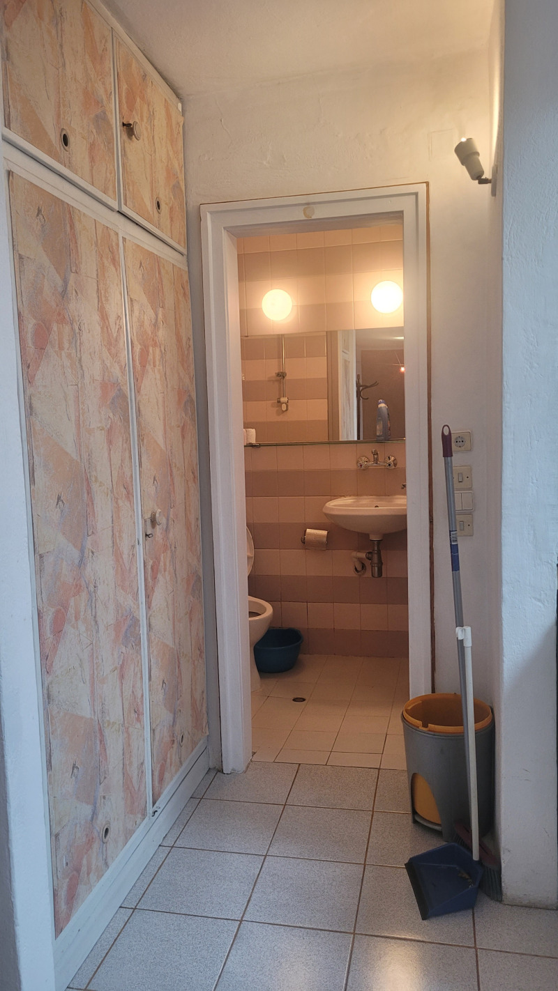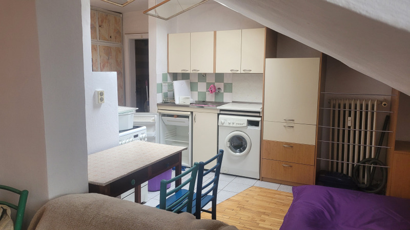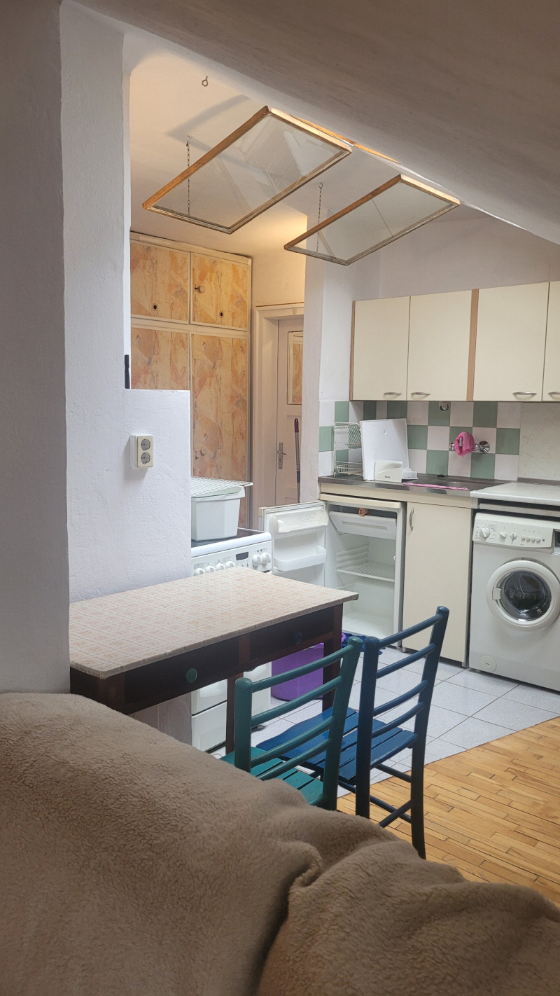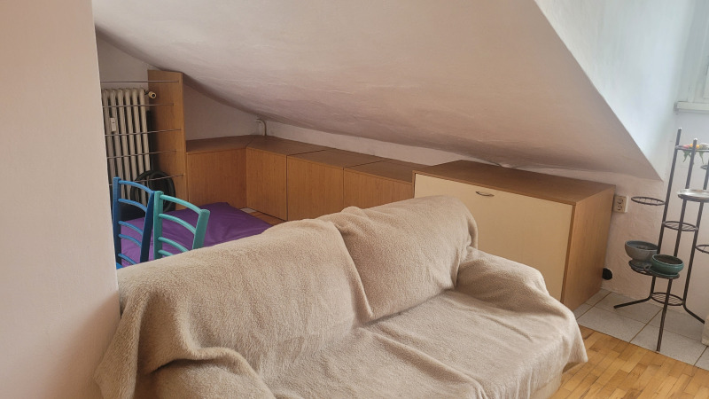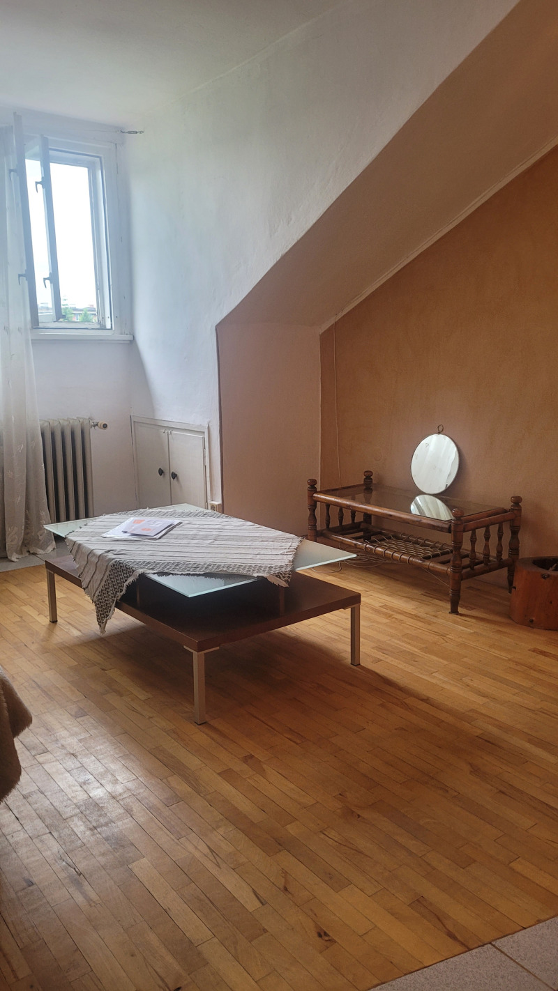 Малък кокетен апартамент тип студио , опън спейс, последен етаж без асансьор, стара стабилна тухлена кооперация на бул.България.Подържан но за освежаване, баня и тоалетна заедно .Близо до спирки на автобуси ,тролей и трамвай, наблизо има много магазини, детски градини и училища.Близо до центъра.