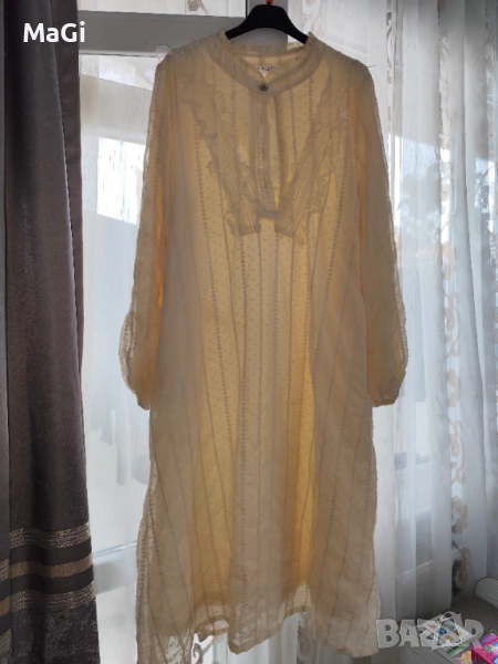 Нова бяла рокля, която стига до колното. Отговаря на ХЛ. Насреща съм за повече подробности