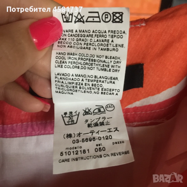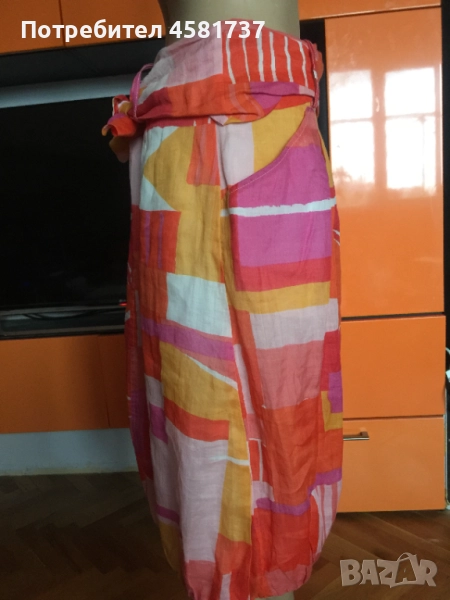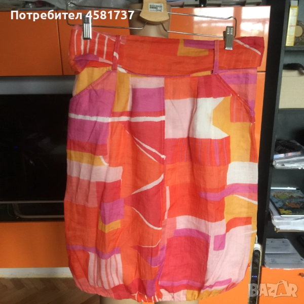 Феерията от топли, ярки, привличащи вниманието цветове превръща тази пола на Max Mara в изключително подходяща дреха за топлите месеци. Полата е с кройка тип балон, със зашита памучна подплата, с джобове от двете страни за удобство. Акцентът е освен в красивата комбинация от цветове, в широкия колан от същата материя, който следва талията. В предната си част той е част от полата, краищата са свободни в задната част, където се връзват. Полата се закопчава с цип в задната централна част. Материята е рамие- една от най-здравите и устойчиви материи. Естествена като памука, но с много по-високо качество. Поради високата цена на тъканта, дрехи с рамие в състава си рядко се срещат, както при нас така и във всички магазини.