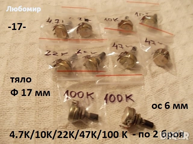17. Малък потенциометър 4.7K/10K/22K/47K/100K - използвано х 2 лв.