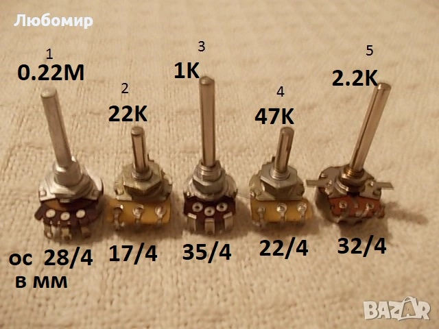 16. Потенциометър 0.22M/22K/1K/47K/2.2K - неизползвано - 5 х 4 лв.