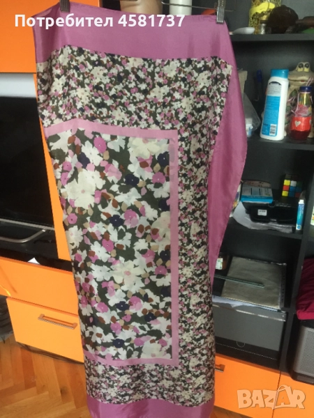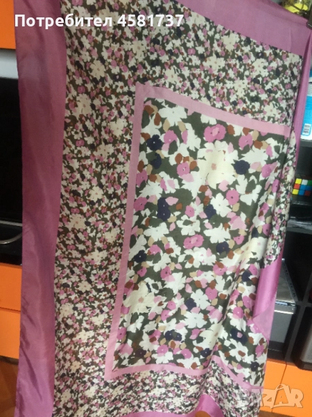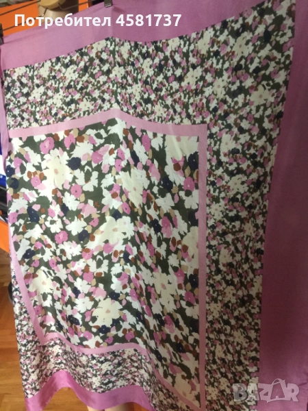 Прекрасен копринен шал в цвят лавандула на бранда Marc O'Polo. Флорален десен, наситени цветове, лъскава, изящна коприна.