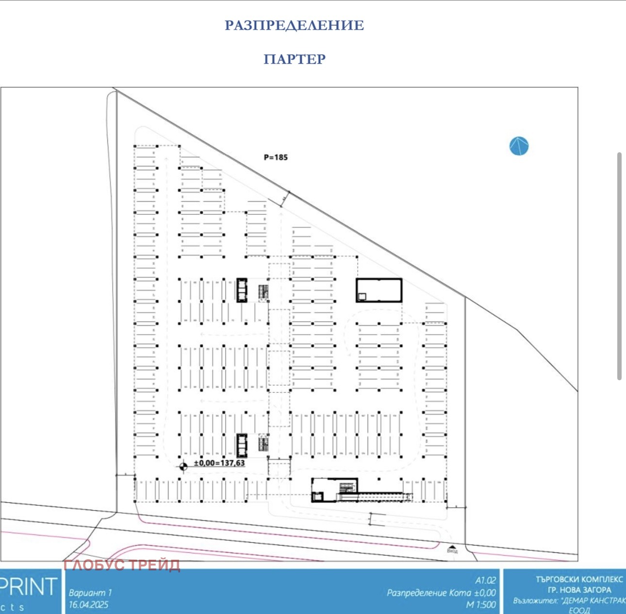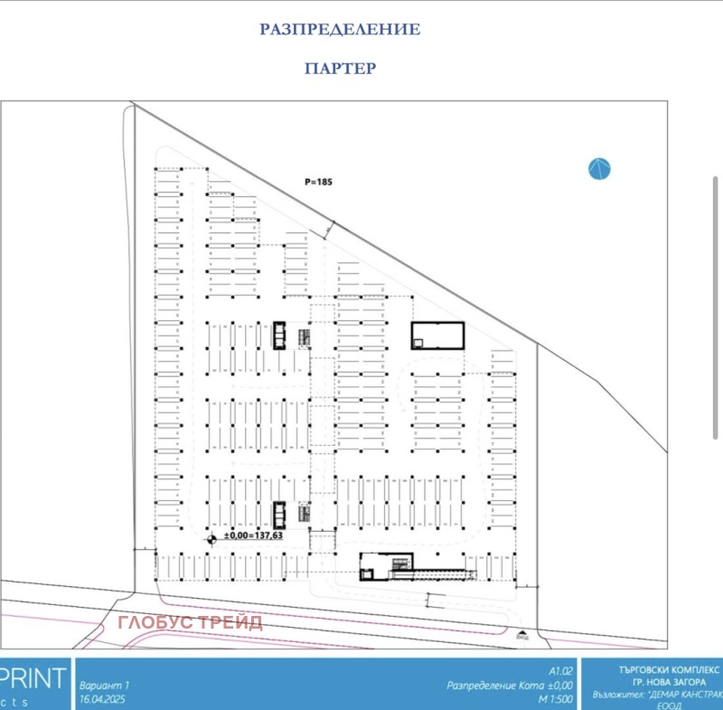 Статус: влязъл в сила ПУП за търговски комплекс, виза,внесен проект за разрешение за строеж, пълна готовност за строителство.