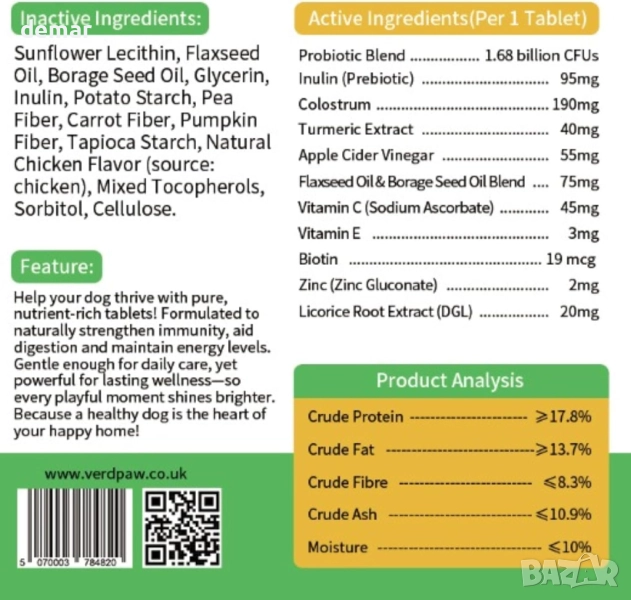 Тази добавка подкрепя имунната система и храносмилането на кучетата със смес от пробиотици, коластра, инулин, ябълков оцет и куркума. Тя помага за облекчаване на сърбежа, насърчава здравата кожа и укрепва естествените защитни сили, като същевременно повишава жизнеността за активен начин на живот. Вкусните таблетки са лесни за даване директно, смесени с храна или натрошени в лакомства.