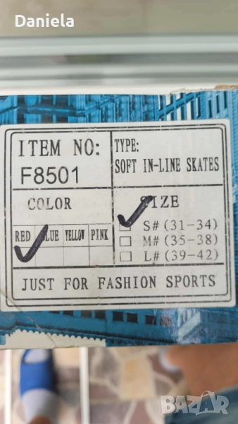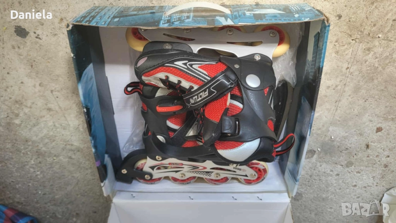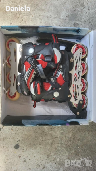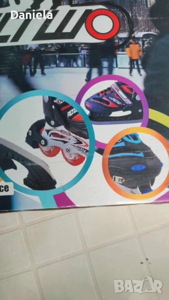 Продавам детски ролери, размера е на кутията, стават от 31 до 34 номер, могат да се преобразуват и на кънки за лед :) не сме го ползвали никога!