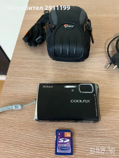 Подаръци с фотоапарата са SD карта памет Integral 2GB и нов, неизползван защитен калъф Lowepro Apex 5 AW (All Weather с дъждобранче). Моля вижте снимките за