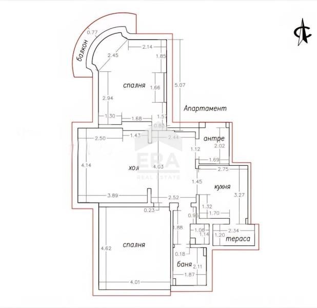 Разпределение: Входно антре, слънчева всекидневна с трапезария, отделен кухненски кът, 2 просторни спални по 20 кв. м., баня с тоалетна, отделна тоалетна и чаровна голяма тераса.