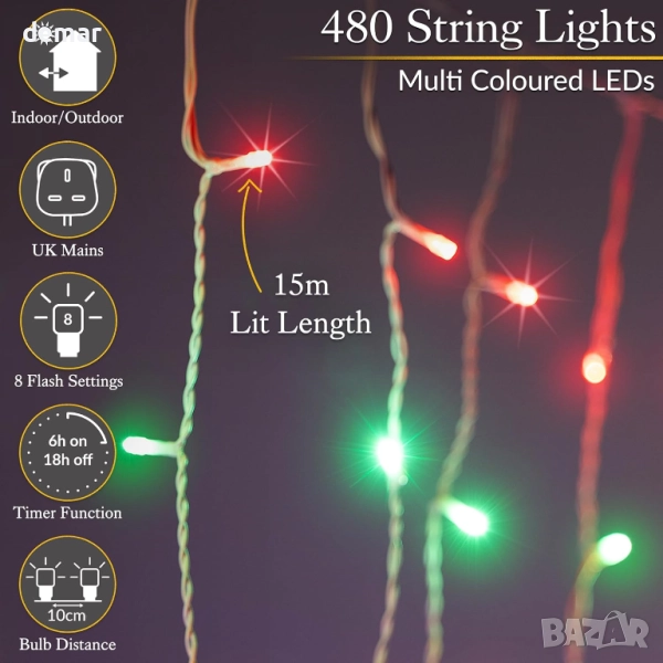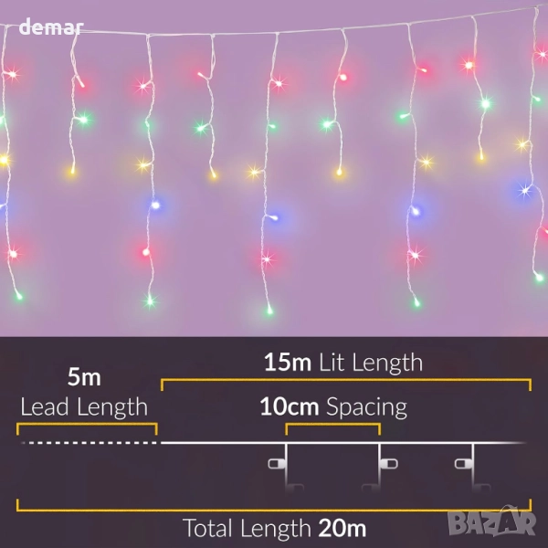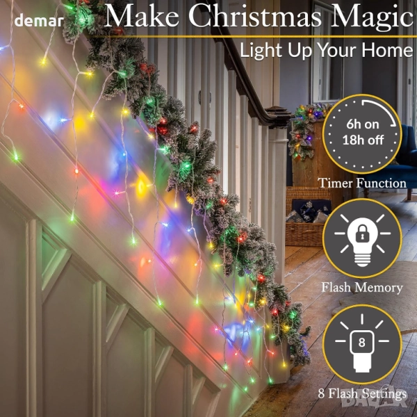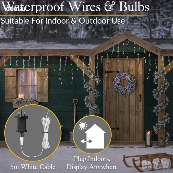 Тези многоцветни лампички тип „ледени висулки“ разполагат с 480 ярки, енергийно ефективни светодиода с дължина от 15 метра, с нишки с различна дължина за блестящ ефект. Те предлагат 8 светлинни последователности с функция за памет, удобна настройка на таймера за 6 часа включено и 18 часа изключено, и се предлагат с 5-метров бял кабел за лесно свързване на закрито, докато се показват на открито. Идеални за покриви, улуци и парапети, те създават празнично, зимно сияние с минимални експлоатационни разходи.