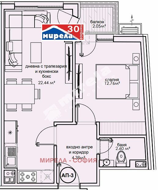 С тази оферта презентирам 2-стаен апартамент със следното разпределение: антре, дневна с кухненски бокс, спалня, баня с тоалетна и балкон.