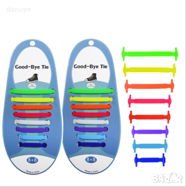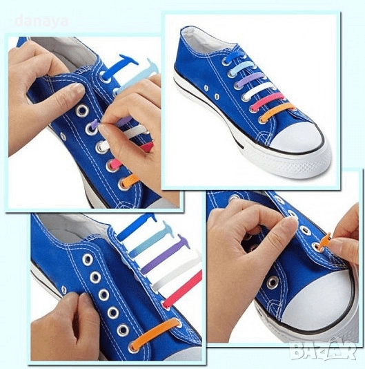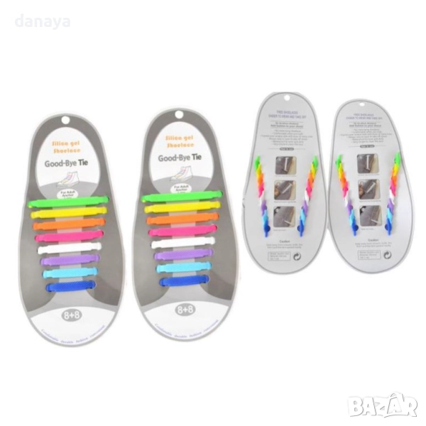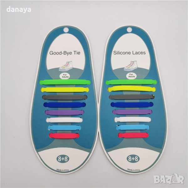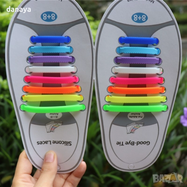 Комплектът включва 16 броя силиконови връзки за обувки в различни цветове.