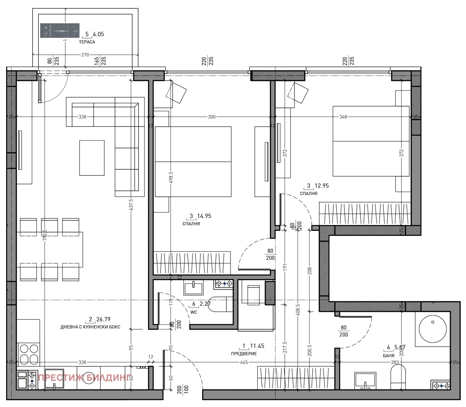 Функционално разпределение: предверие, дневна с кухня и трапезария, 2 спални, 2 бани с тоалетна, склад и тераса.