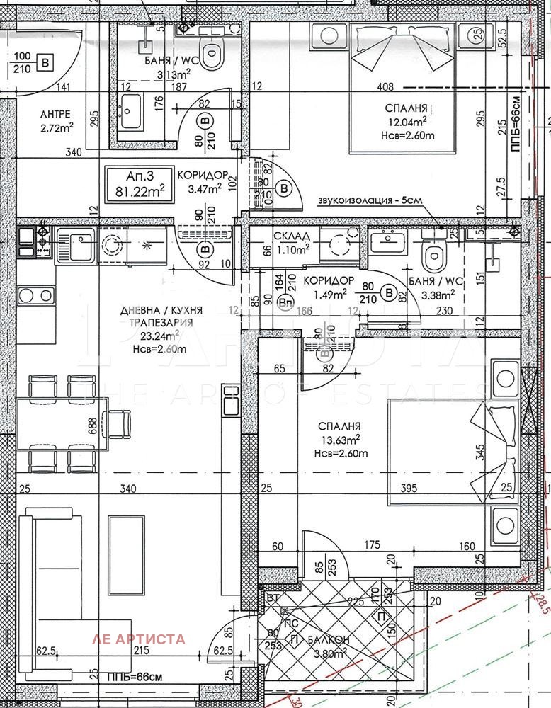 Състои се от: антре/2.72кв.м./, коридор 1/3.47кв.м./, коридор 2/1.49кв.м./, дневна с кухненски бокс/23.24кв.м./,спалня 1 /13.63кв.м./, спалня 2/12.04кв.м./, баня с тоалетна 1/3.13кв.м./, баня с тоалетна 2/3.38кв.м./, склад/1.10кв.м./, общ балкон /3.80кв.м./. Изложение юг.