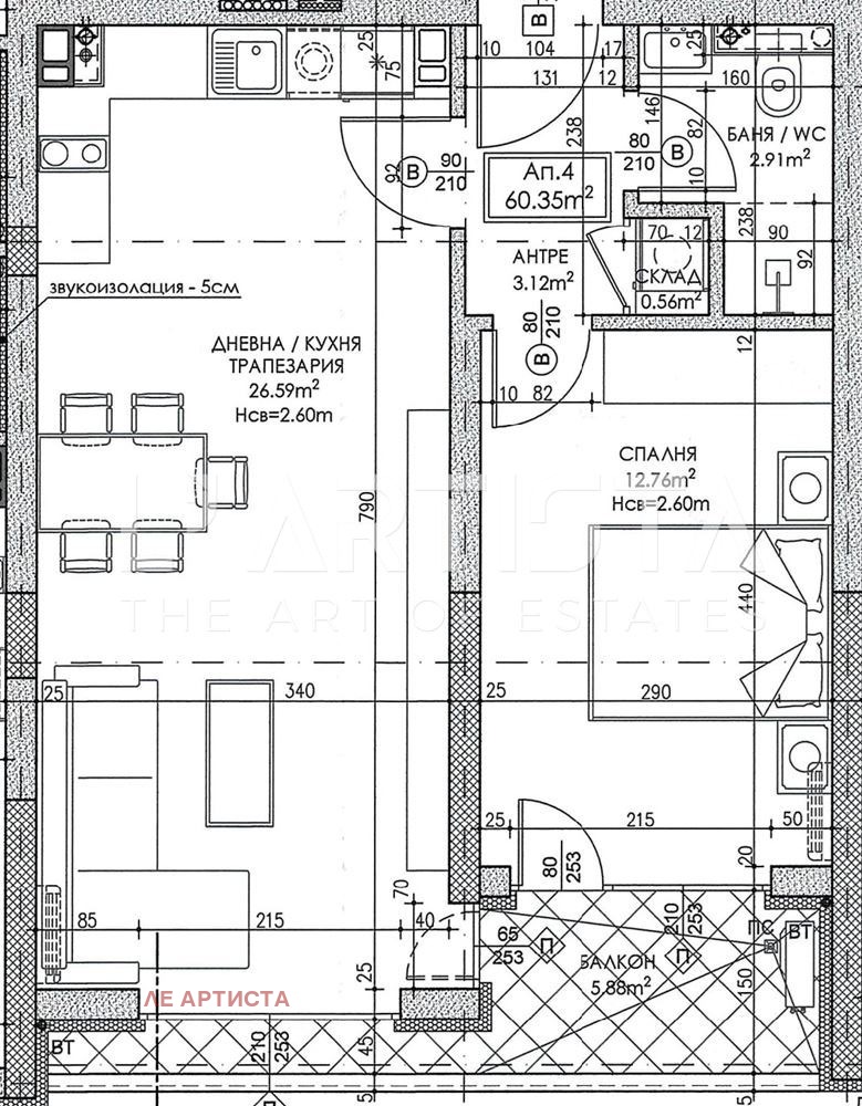 Състои се от: антре/3.12кв.м./, дневна с кухненски бокс/26.59кв.м./, спалня/12.76кв.м./, склад/0.56кв.м./, баня с тоалетна/2.91кв.м./ и общ балкон/5.88кв.м./. Изложение югозапад.