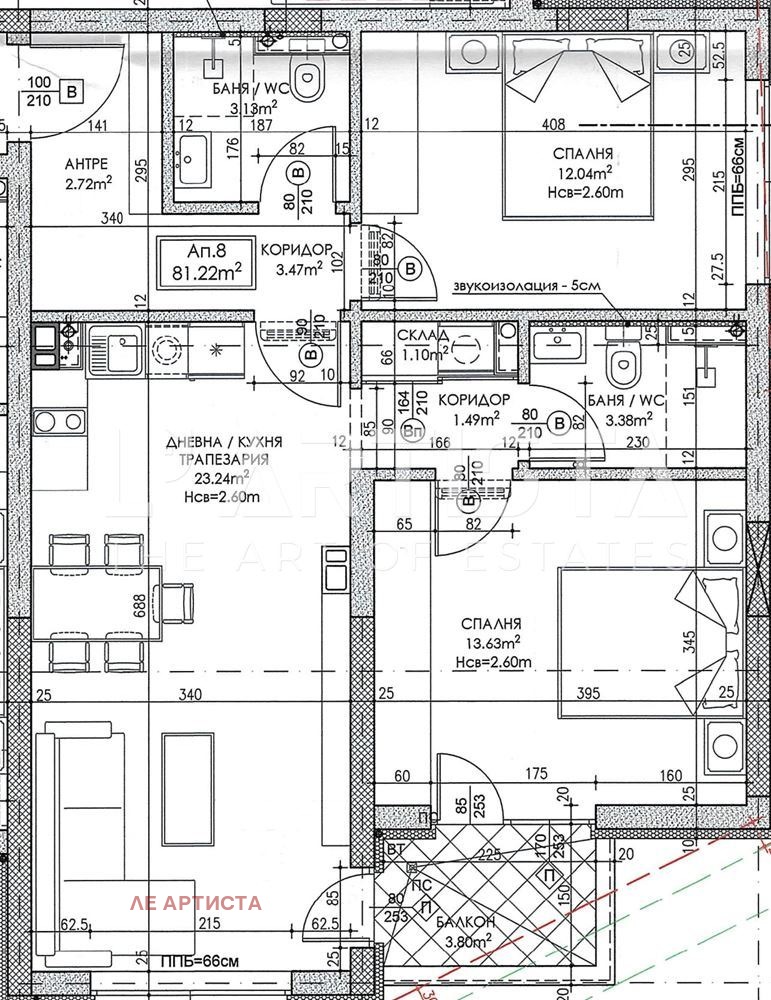 Състои се от: антре/2.72кв.м./, коридор 1/3.47кв.м./, коридор 2/1.49кв.м./, дневна с кухненски бокс/23.24кв.м./,спалня 1 /13.63кв.м./, спалня 2/12.04кв.м./, баня с тоалетна 1/3.13кв.м./, баня с тоалетна 2/3.38кв.м./, склад/1.10кв.м./, общ балкон /3.80кв.м./. Изложение изток.