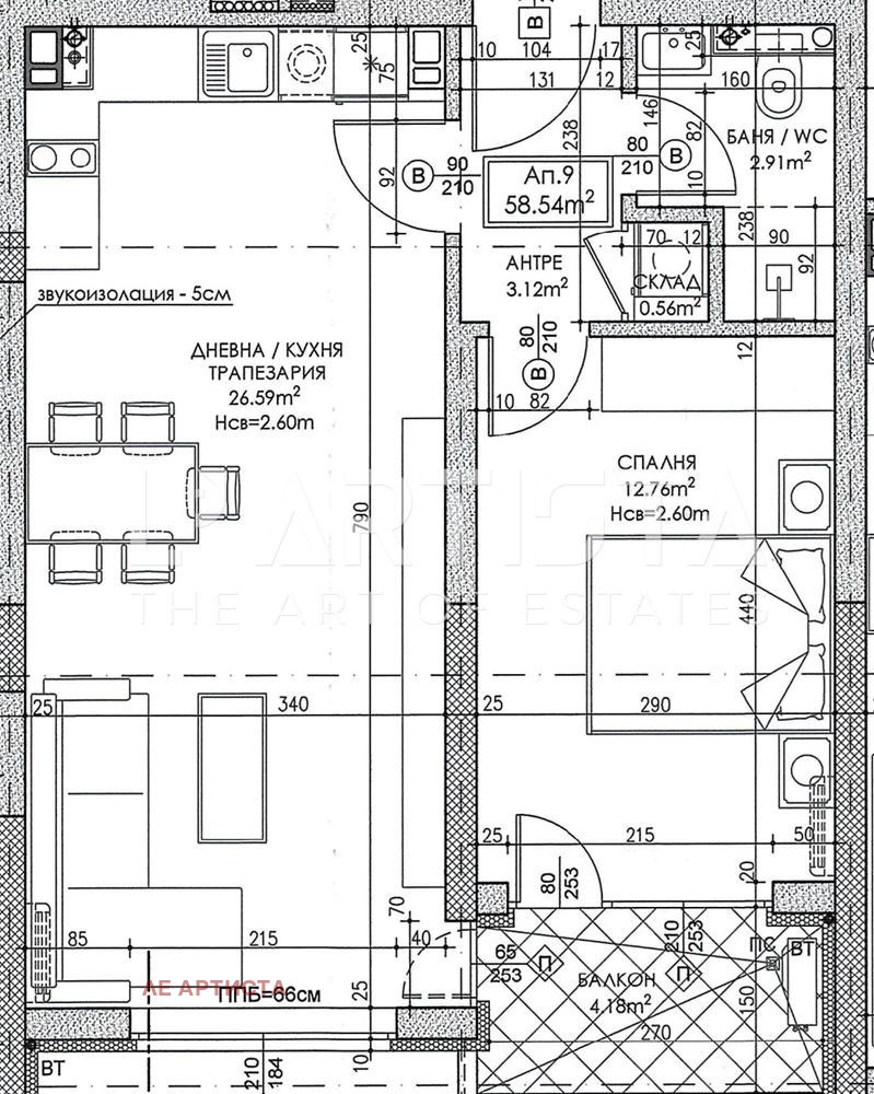 Без комисиона от купувача! Двустаен тухлен апартамент 9 със застроена площ от 58.54кв.м.(68.23кв.м. с общите части).