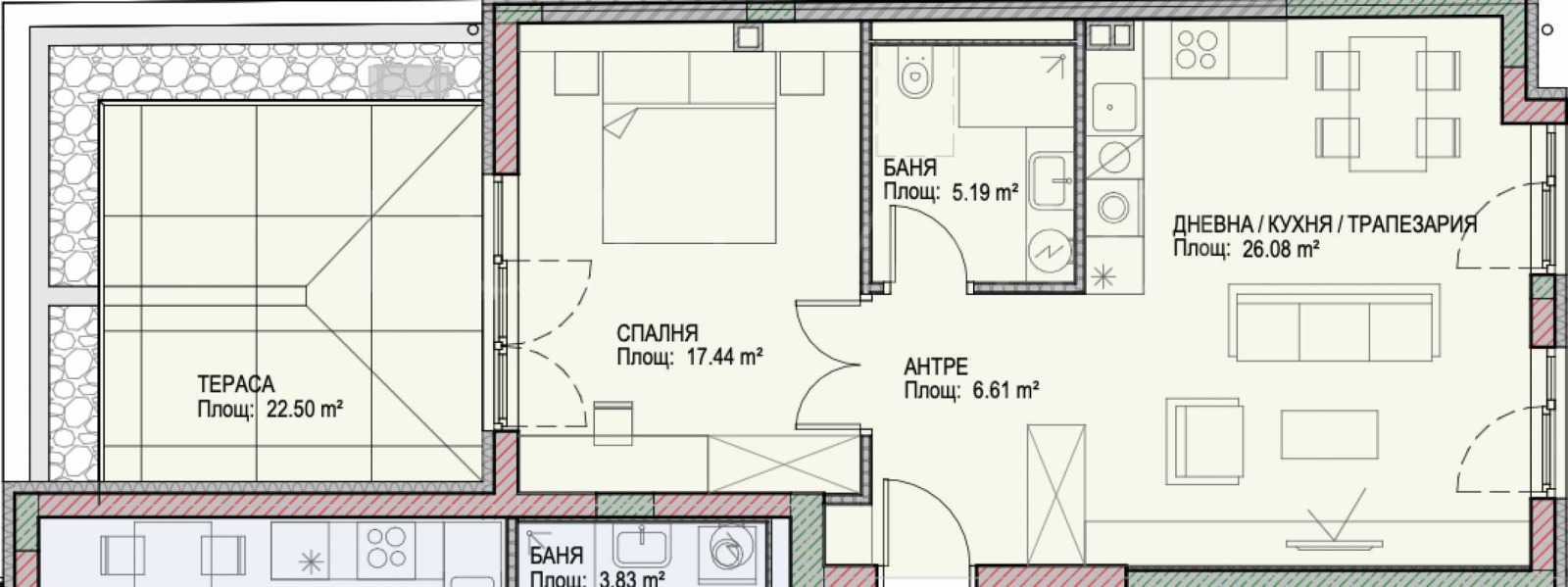 Конкретната оферта е за двустан апартамент #А07, намиращ се на четвърти жилищен етаж, с площ 99.86 м2, разпределен между просторна всекидневна с кухненски бокс, спалня, баня с тоалетна, антре и балкон.