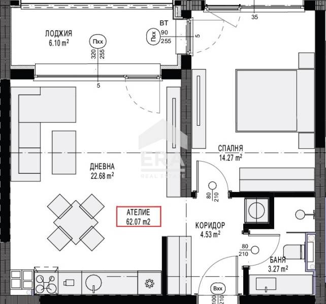 Жилището е със застроена площ от 62 кв.м. и се състои от входно антре, просторна дневна с кухненски бокс, спалня, баня с тоалетна и лоджия.