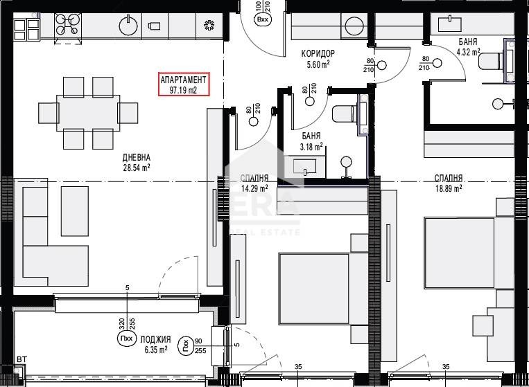 Жилището е със застроена площ от 97 кв.м. и се състои от входно антре, просторна дневна с кухненски бокс, две спални, две бани с тоалетна и лоджия.