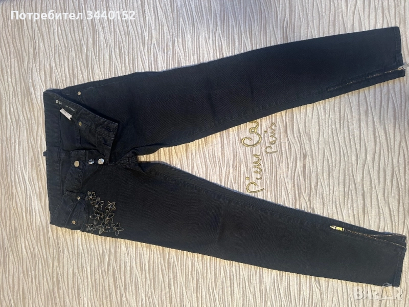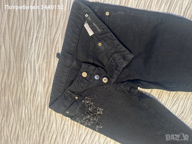 Продавам оригинални дамски дънки Dsquared² в черно, с красиви флорални апликации отпред, златисти копчета и златисти ципове на крачолите. Моделът е стилен, модерен и подчертава фигурата.