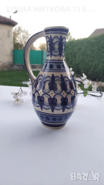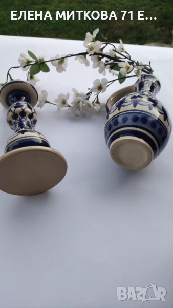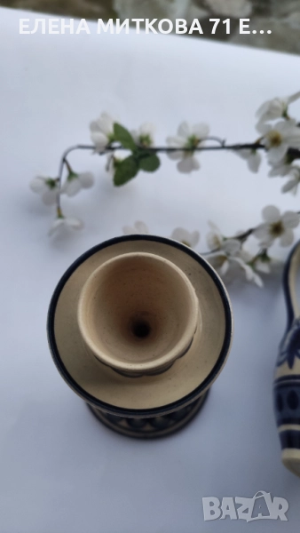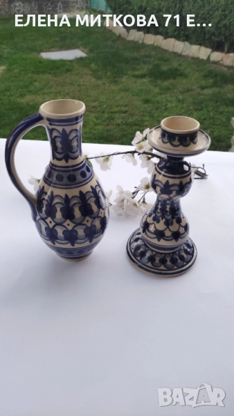 Керамичен лот в екрю и синьо - кана и свещник/без маркировка/.Според проучванията ми-производство ГДР
