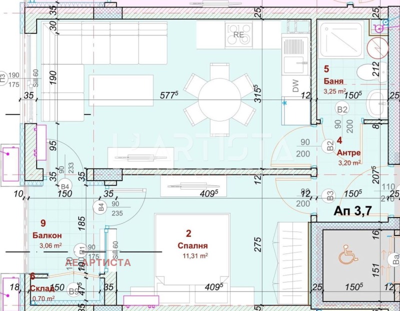 L'Artista представя двустаен тухлен апартамент със застроена площ от 46.35кв.м.(55.54кв.м. с общите части).