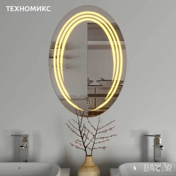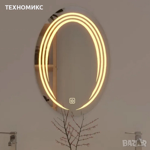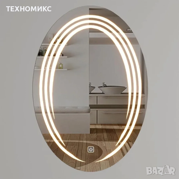 Елегантно осветено овално огледало за баня с размери 60x90 см. Огледалото има три цвята на осветлението, което може да се регулира според предпочитанията. Подходящо за модерен интериор на баня.