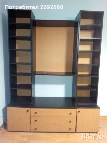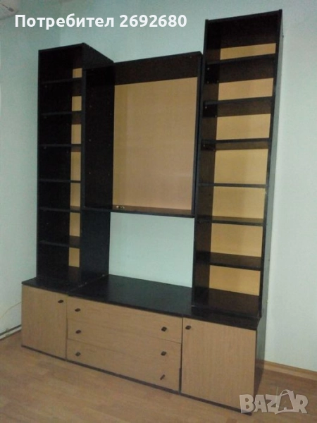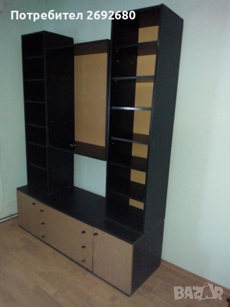 Секцията има чекмеджета 3бр., рафтове за книги, стъклена част с три рафта за чаши или сувенири и две