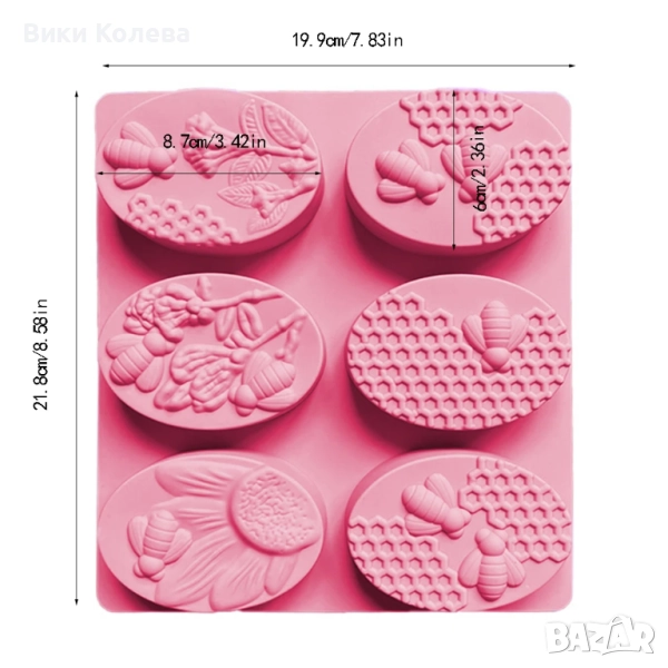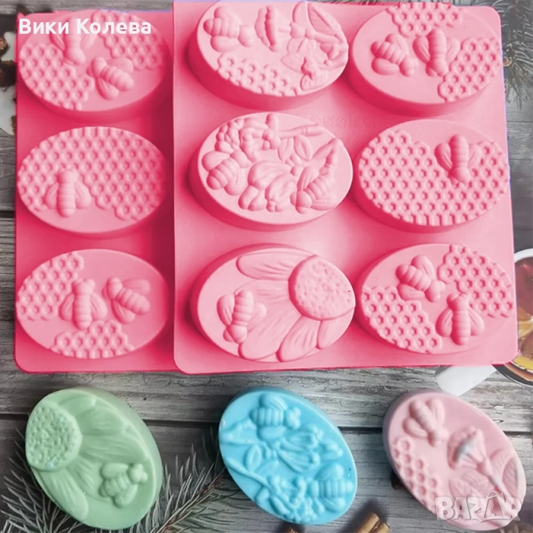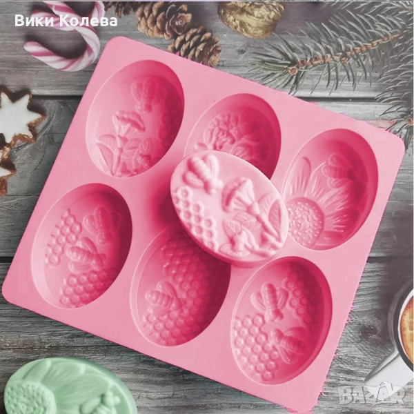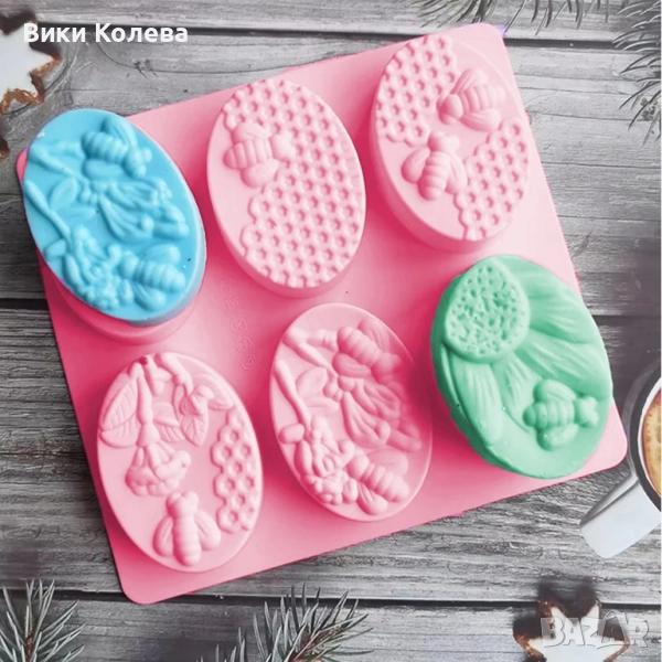 Прекрасна висококачествена силиконова форма с 6 различни кухини в овална форма с релефни мотиви на пчели, цветя и пчелна пита. Подходяща както за печене, така и за изработка на сапуни, свещи или декоративни изделия.