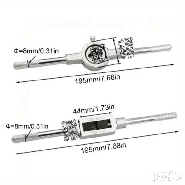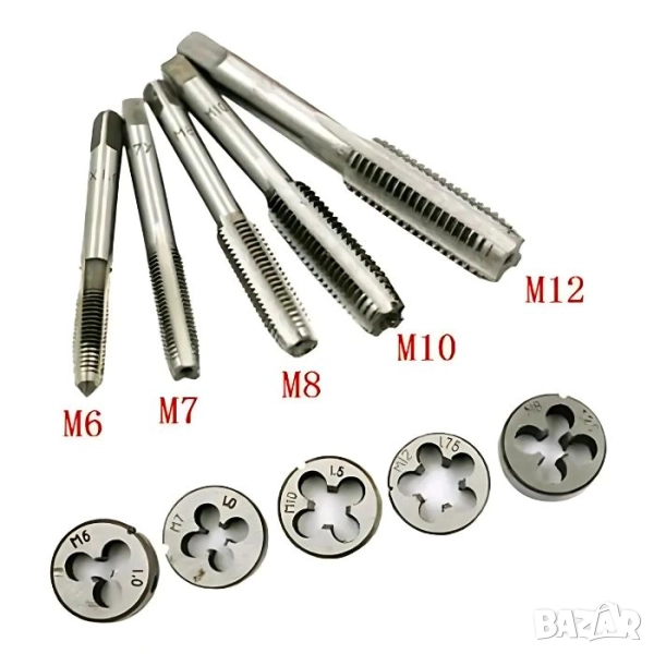 Комплект от 12 части – включва различни размери метчици, плашки и държачи. Съдържа метчици и плашки с размери: M6, M7, M8, M10, M12