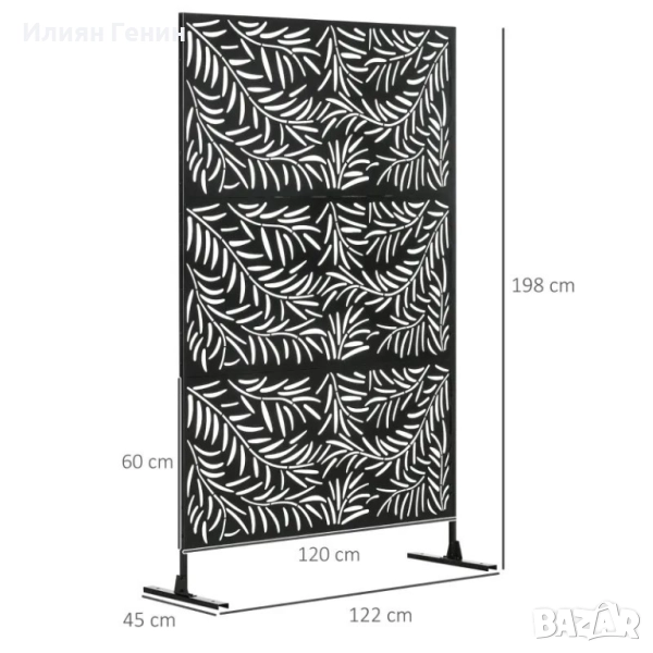 Градинска преграда: Състои се от три вертикални панела, всеки с размери 60 x 120 см. Общите размери са 122Д x 45Ш x 198В см.