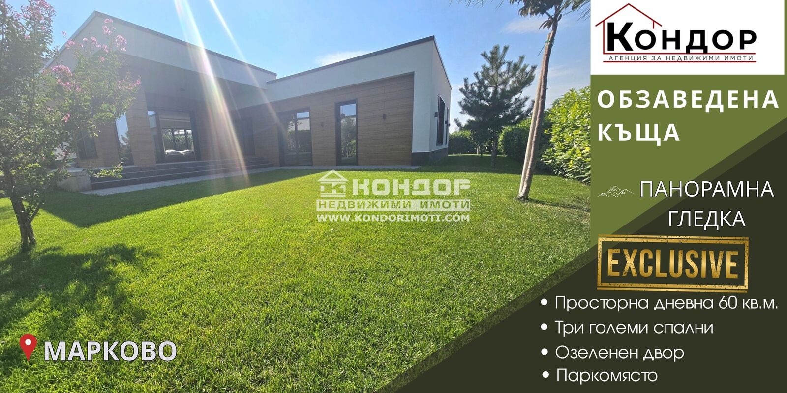 Оферта 67843: ЕКСКЛУЗИВНО от КОНДОР !!! ЛУКСОЗНА ЗАВЪРШЕНА КЪЩА !!! ПАНОРАМНА ГЛЕДКА !!! Предлагаме Ви да закупите ново изградена и супер луксозно ЗАВЪРШЕНА къща, ситуирана в собствен парцел , с панорамна гледка към град Пловдив. Основните й предимства са модерната архитектура, добрата локация и функционалното разпределение на жилищната площ. Къщата е с РЗП от 195 кв.м., като 172 кв.м. от тях са разпределени на едно ниво и 23кв.м. са покрита веранда , на която се излиза от дневната . Състои се от просторна и светла дневна 60 кв.м., трапезария и кухненска част, предвидено място за камина и излаз към страхотна веранда . Просторен и коридор отвежда към три самостоятелни спални с площ от 17.00кв.м. , като едната от тях разполага със собствена баня с тоалетна и дрешник, а втора баня с тоалетна обслужва двете детски стаи. При изпълнението е заложено на висококачествени материали, червена Австрийска Тухла, троен стъклопакет на шест камерна дограма, 10см. външна изолация, изградена и оформена външна планировка. Къщата в момента е завършена до ключ и частично обзаведена по ДИЗАЙНЕРСКИ ПРОЕКТ , на който прикачвам снимки в обявата. Парцела е с площ от 512кв.м. и допълнително има 80кв.м. идеални части от обслужващия път и лицева зелена площ. . Паркирането е подсигурено с паркомясто пред самата къща . Възможност за закупуване чрез Банков Кредит !!!