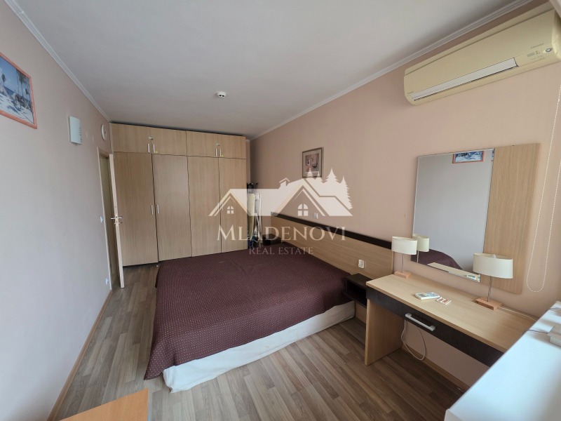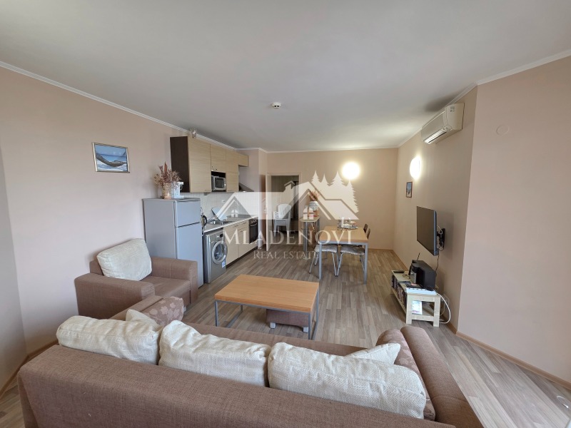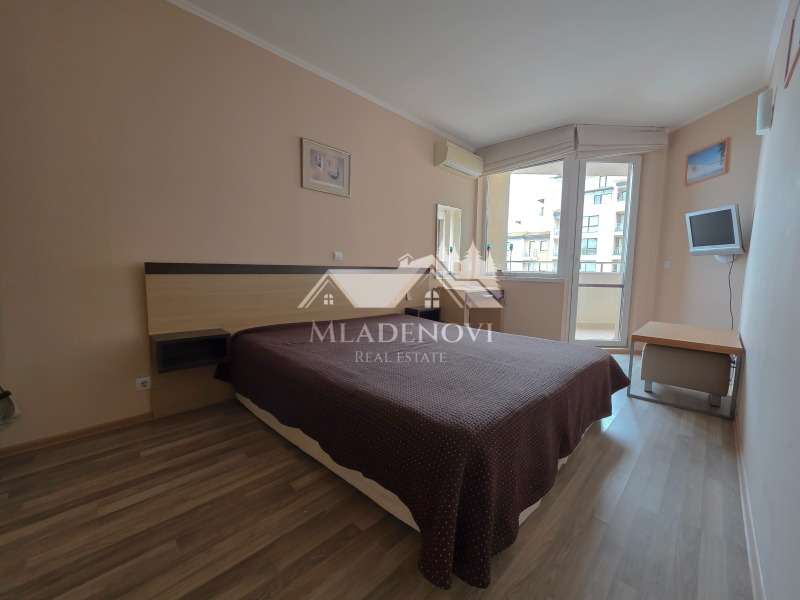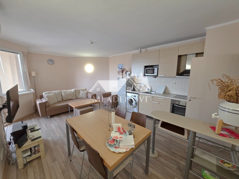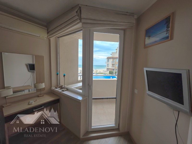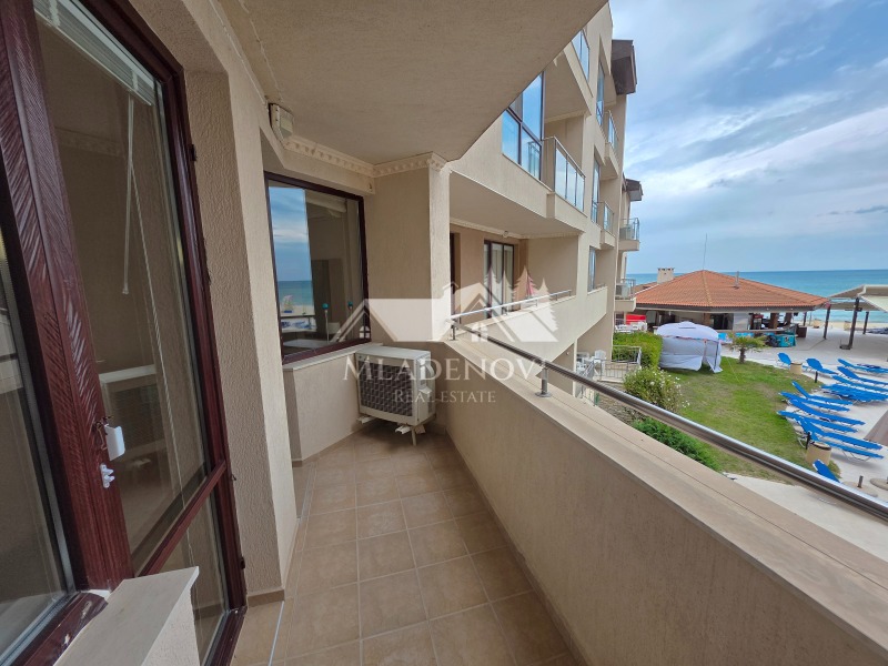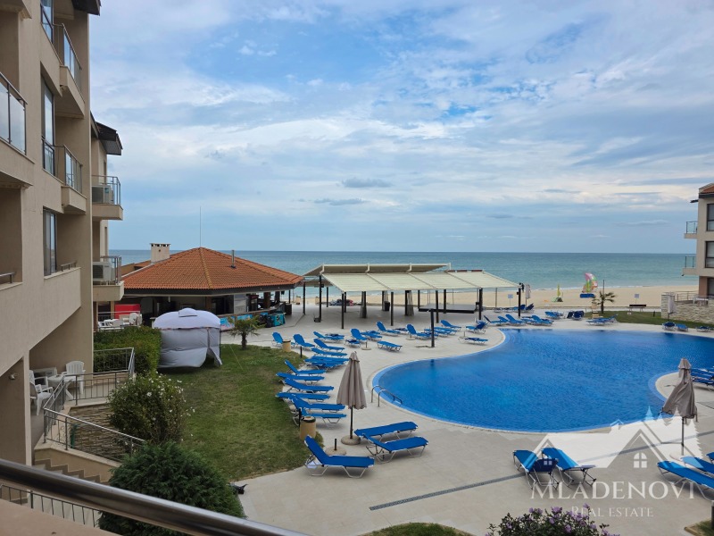 първа линия море. Комплексът предоставя чудесни условия за пълноценна почивка - басейни, в това число и детски, спа център, фитнес, ресторант с открита тераса, паркинг, детска площадка, супермаркет и др. Въздухът и морската вода са изключително чисти. Жилището се състои от всекидневна с кухненски кът, самостоятелна спалня, голяма тераса обща за двете стаи, от която се открива чудесна гледка към морето и към басейна, предверие и баня с тоалетна. Имотът се продава с наличното обзавеждане и оборудване. Жилището е изключително светло и слънчево, с югоизточно изложение. Такса поддръжка - в размер 1173 евро/годишно. Агенцията съдейства за отпускане на ипотечен кредит за финансиране покупката на този имот, както и безплатно юридическо обслужване през целия процес на сделката.