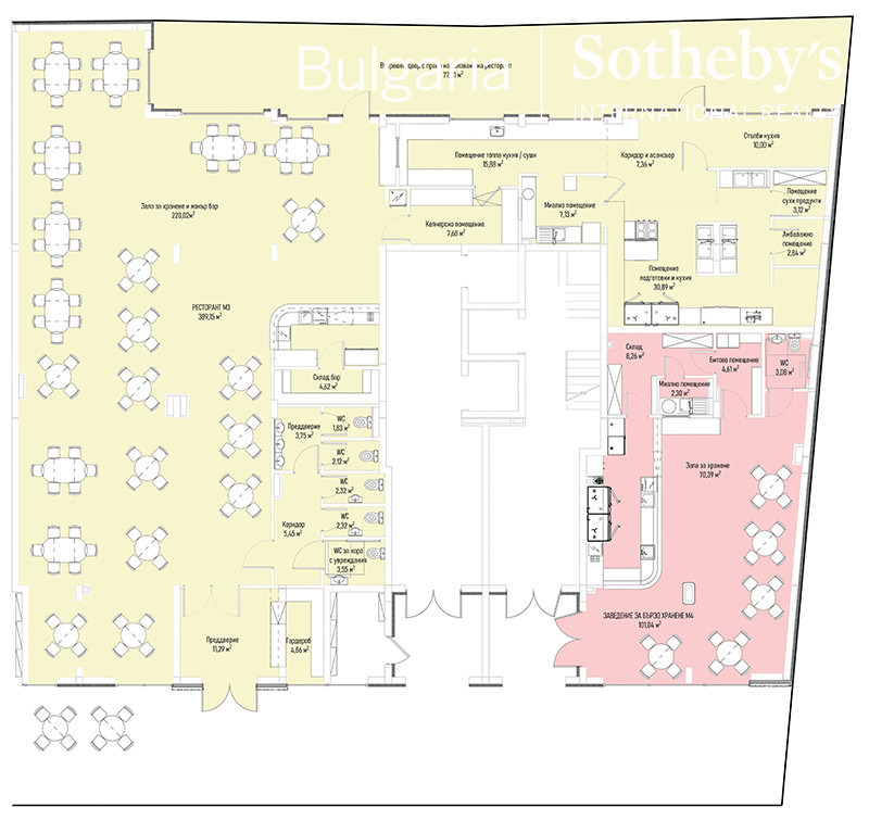 Разпределение: Състои се от просторна търговска зала с капацитет 102 човека, гардеробна, тоалетни, бар зона с обособен склад, просторна кухня с необходими помещения. Към ресторанта има 76.06 кв.м двор.