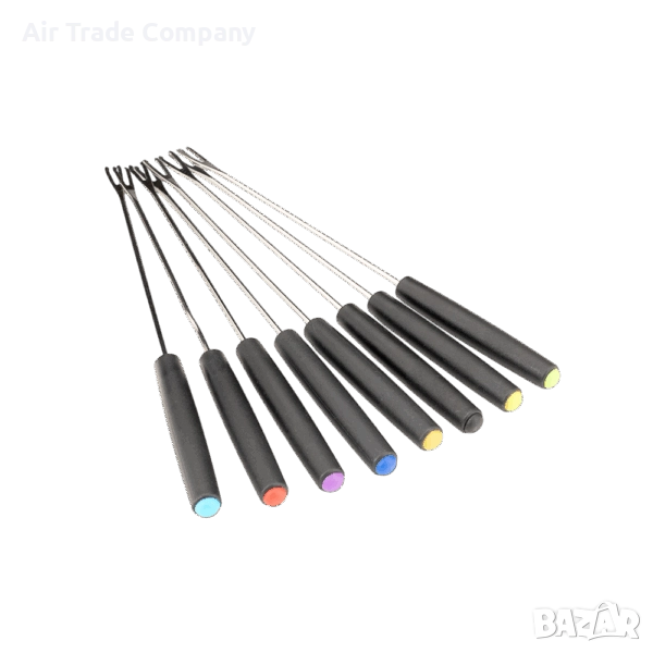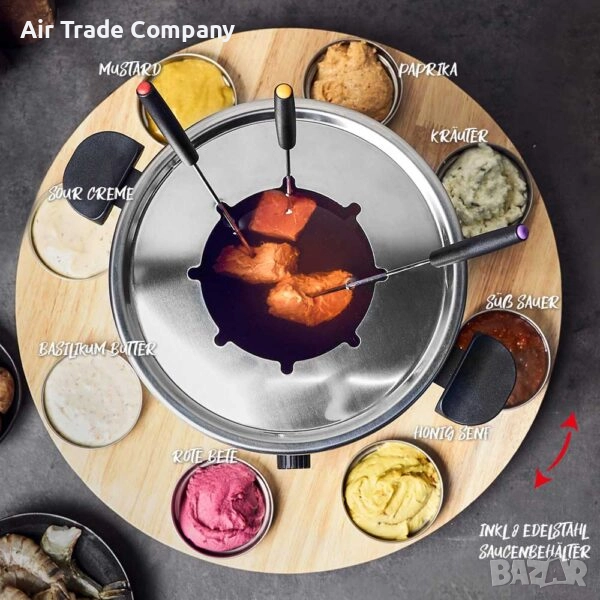 В комплекта са включени тенджера с незалепващо покритие и капак, подходяща за съдомиялна машина, 8 вилици за фондю от неръждаема стомана и въртяща се поставка с 8 отделни контейнера за сос.