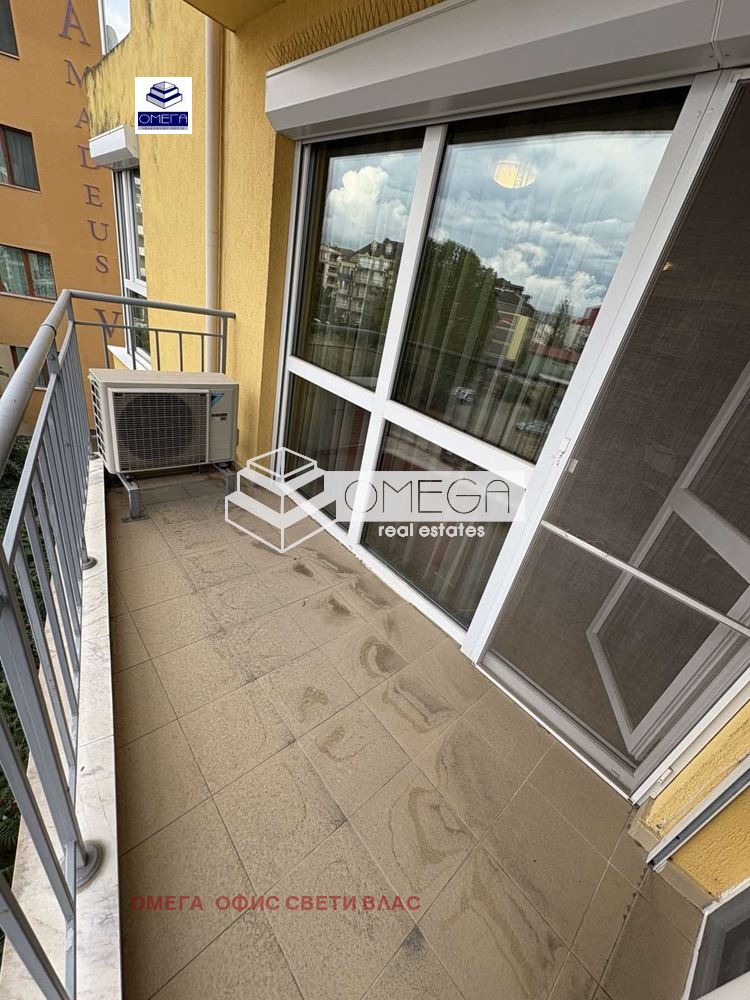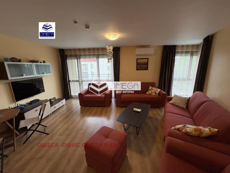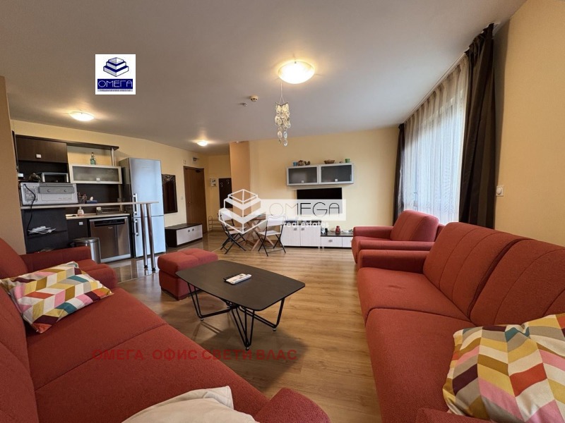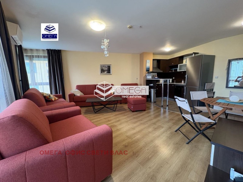 Без такса поддръжка!Недвижими имоти ОМЕГА, Ви предлага за продажба страхотен двустаен обзаведен апартамент с площ 83.40 кв.м. на 4 етаж с разпределение:входно антре, кухня с дневна, спалня,баня с тоалетна и една обща тераса с панорамна гледка .Апартамента е обзаведен и оборудван изключително стилно и уютно с много качествени италиански мебели ,висок клас обзавеждане на техника ,нова кухня , smart телевизия,климатик Daikin,изключително обезшумен със сменена 5-камерна ПВЦ дограма и външни електрически ролетни щори!.Апартамента се намира в к-с Livi Paradise,к.к.Слънчев Бряг който разполага със басейн, два асансьора,собствен паркинг,на пешеходно разстояние от центъра на комплекса и плажа!В близост се намират детска градина,множество магазини и ресторанти работещи целогодишно!Апартамент подходящ за постоянно живеене!
