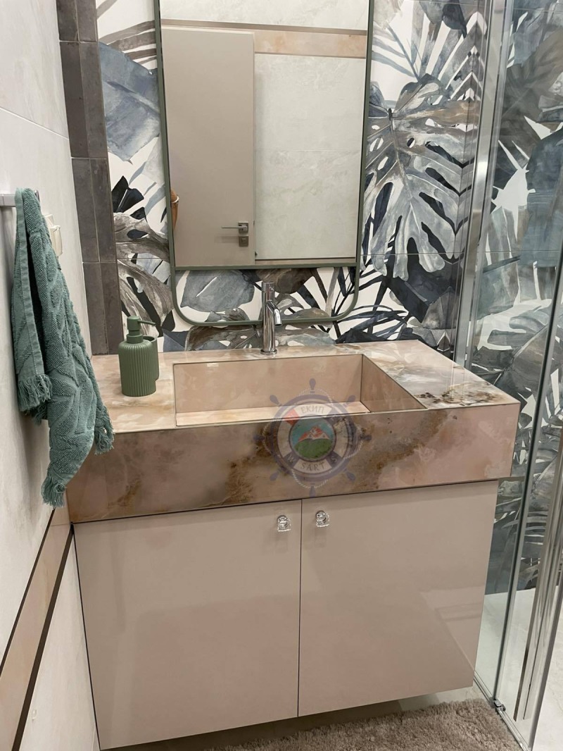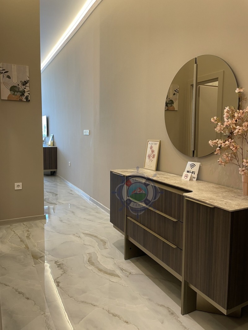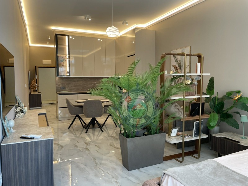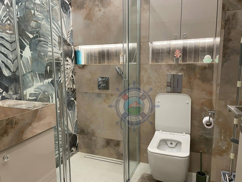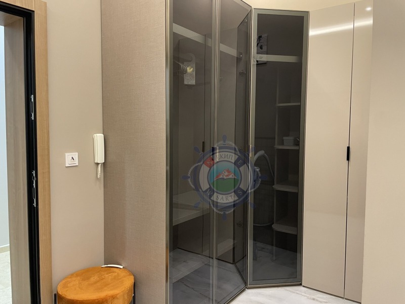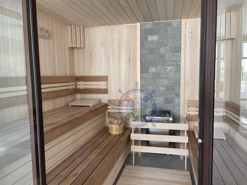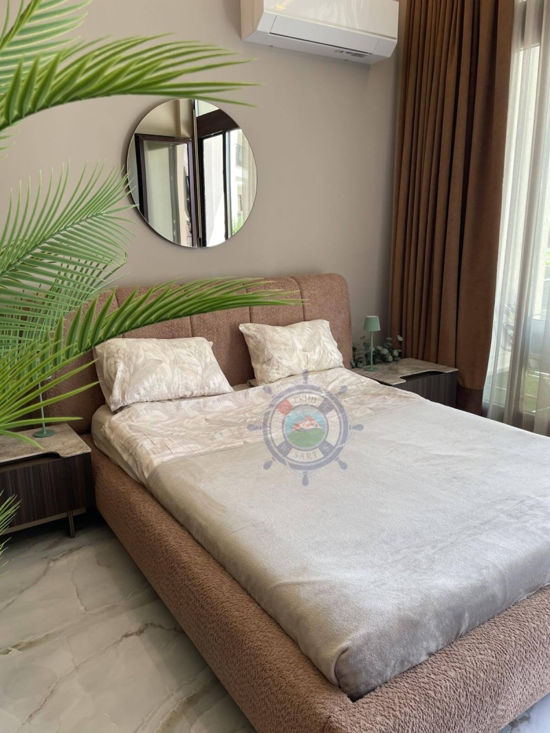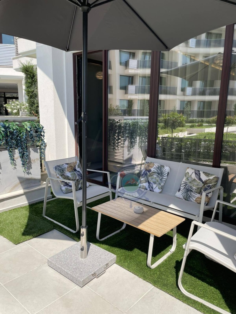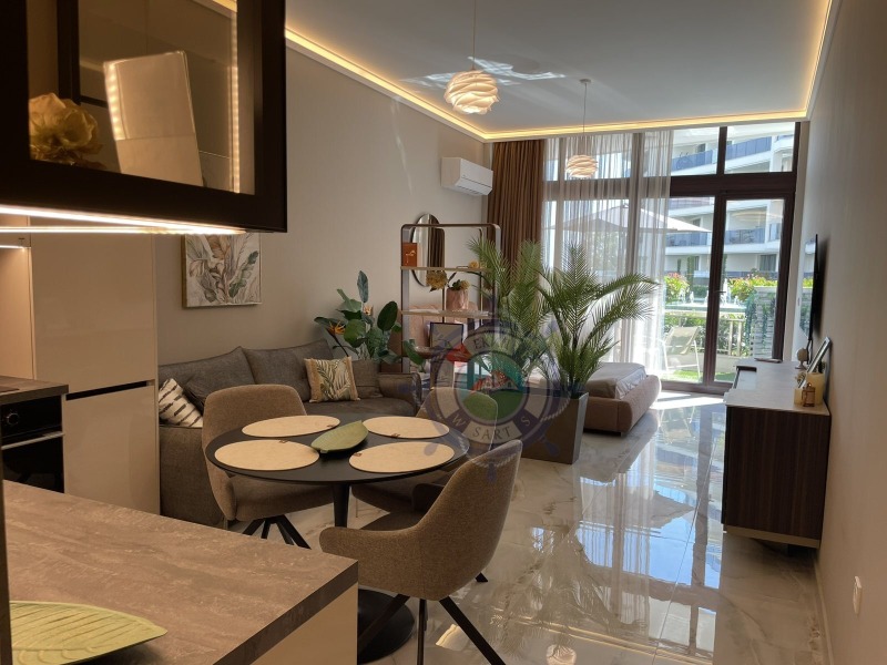 Апартамента,който ви предлагаме е с площ 64 кв.м и е направен с много вкус и стил към детайла.В едно помещение са разпределени функционално- коридор, кухня оборудвана с всичко необходимо, уютна спалня с двойно легло, от която се излиза на веранда с изглед към озелененият вътрешен парк и шадраваните. Елегантна баня с душ кабина, пералня със сушилня. Прекрасната гледка и комфорт,ще ви донесат усещането за лукс и спокойствие край морето.