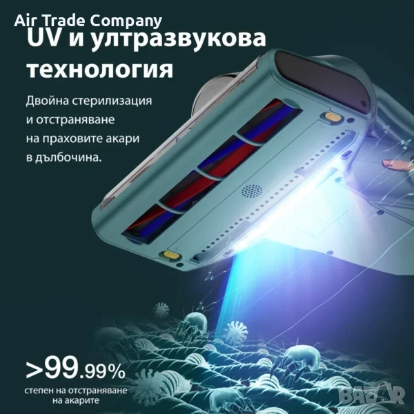 Благодарение на иновативната технология за UV стерилизация, BX7 Pro елиминира прах, акари и бактерии в дълбочина. Прахосмукачката излъчва ултравиолетови вълни с дължина от 253 nm, които унищожават 99,99% от праховите акари.