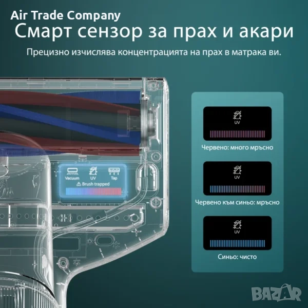 Интелигентният сензор изчислява с висока точност количеството прах и прахови акари в дадена зона. Червена светлина индикира високо замърсяване, а синята показва перфектно почистена повърхност.