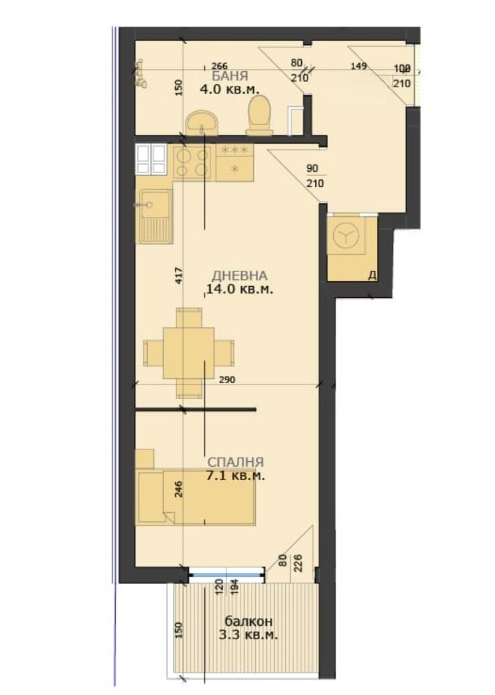 БУЛИМОТ представя на вашето внимание едностаен, делим апартамент в новострояща се сграда в центъра на града. Състои се коридор, дневна с кухненска част, спалня, тераса, баня с тоалетна, избено помещение.