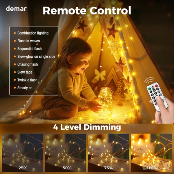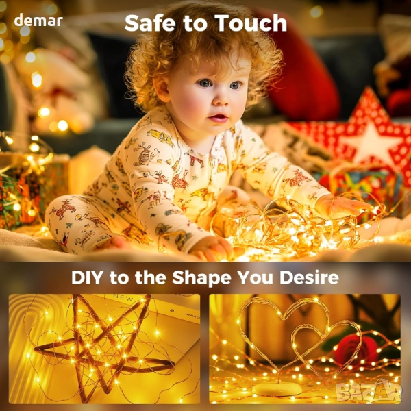 Тези 20-метрови вътрешни лампички са с 200 топли светодиода и 5-метров кабел, идеални за декориране на спални, дневни, градини или празнични декорации. Предлагат се с дистанционно управление, предлагащо четири нива на яркост, осем режима на осветление и опции за таймер за лесно персонализиране. Изработени от здрава, огъваща се медна тел, те са издръжливи, гъвкави и идеални за „Направи си сам“ проекти. Лампичките са водоустойчиви както за вътрешна, така и за външна употреба (щепселът не е водоустойчив) и включват адаптер за ниско напрежение за безопасност, което гарантира, че ще останат хладни на допир и безопасни за деца и домашни любимци.