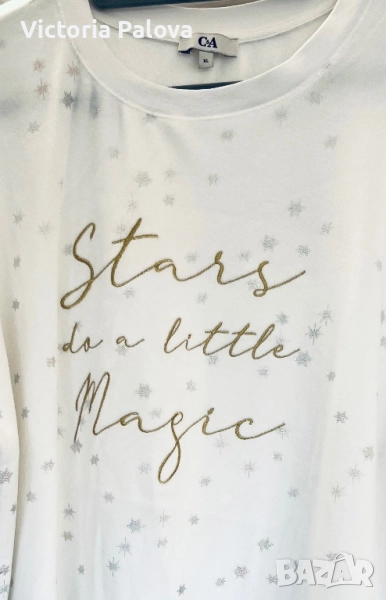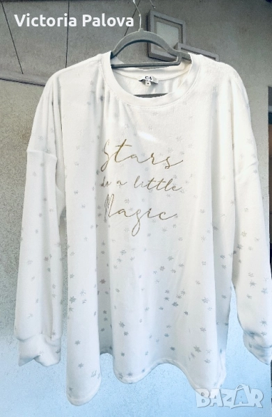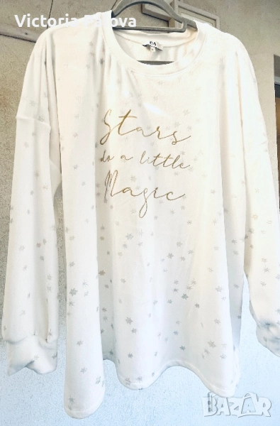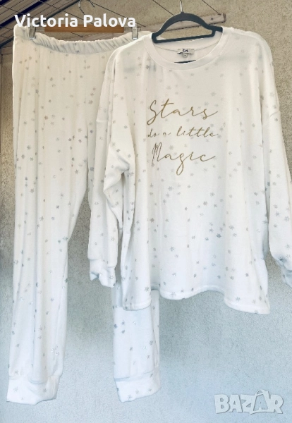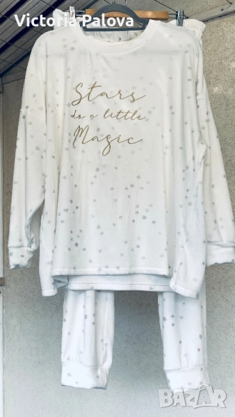 Мека, нежна, изключително приятна на допир, носеща уют и комфорт в студените вечери. Леката ѝ материя гали кожата, а в същото време е достатъчно топла. Украсена е със сребристи нежни звездички и надпис “ звездите правят малко вълшебство” . Това не е просто пижама , а малък лукс за всеки ден - стилна, практична, елегантна. Идеална е за уют у дома или като подарък. Рамо - 73см( паднало), ГО - 71см, дължина - 70см, ръкав - 44см. Долнище : дължина - 104см, отвътре крачол- 75см, талия - 44-66см ( ластик), широчината на крачола горе - 41см, долу - 22см.
