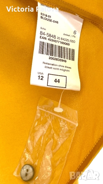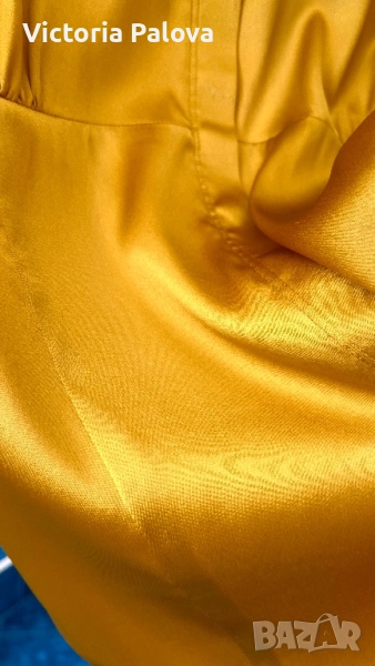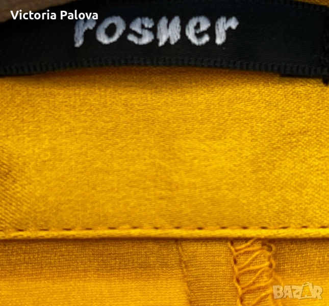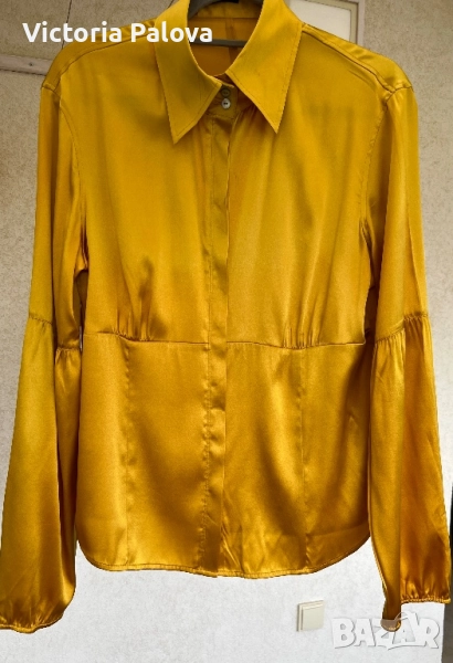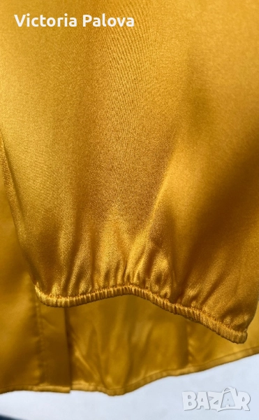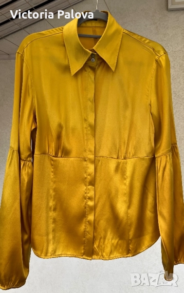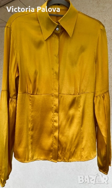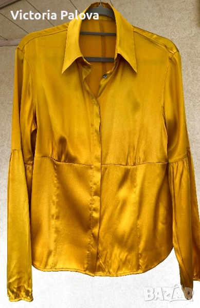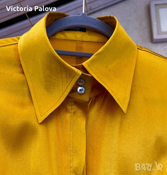 коприна с добавен еластан за комфорт ( 93% коприна , 7% спандекс). Немската марка Rosner е известна със своите премиум материи и изключителна изработка. Цветът е наситено златисто-жълт, с нежен сатенен блясък - истински акцент във всеки гардероб. Елегантна и модерна кройка с деликатно набиране на ръкавите. Ризата е много стилна , подходяща както за официални поводи, така и за ежедневие с вкус. Рамо - 46см, ГО -58см, по шева - 52см, дължина - 67см, ръкав - 65см.