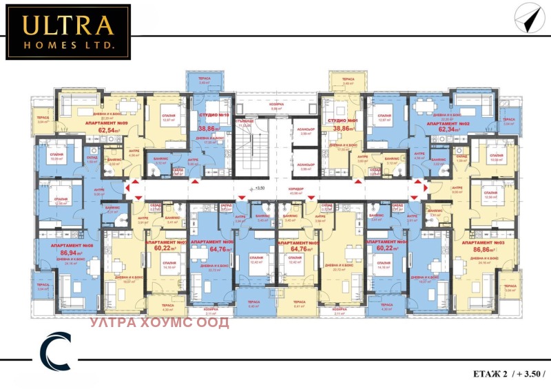 Имотът се намира на 2-ри жилищен етаж с изложение юг-изток и се състои от входно антре, просторна всекиднева, спалня, баня+тоалетна, склад и тераса.