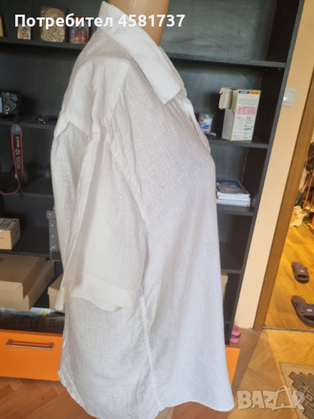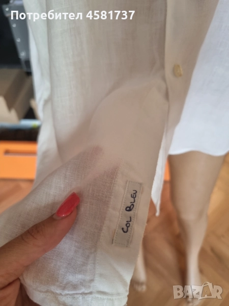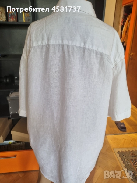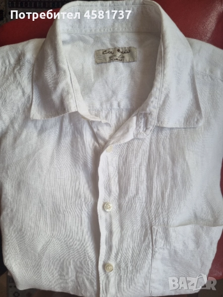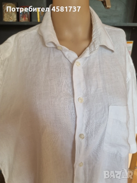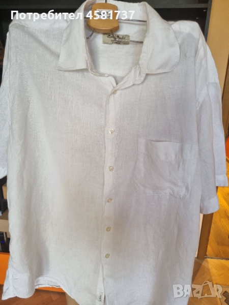 Бяла ленена мъжка риза.Класическа свободна кройка от най- подходящата материя за лятото- лен. С един външен джоб. Ризата е на френски бранд, който е изписан в долната, завършваща част на ризата( снимка 2).