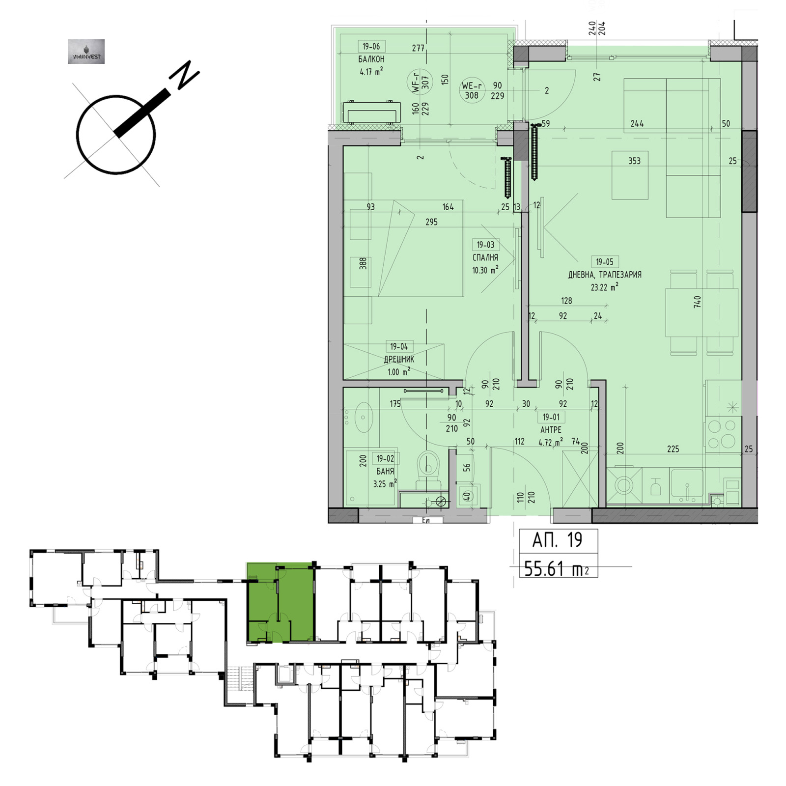 Апартаментът /Ап.19/ е с площ от 67,01 кв.м. и е на трети етаж.
