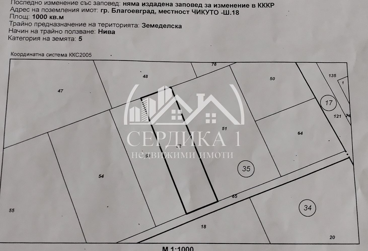 Имоти Сердика 1 предлага на Вашето внимание парцел с площ от 1000кв.м находящ се в гр. Благоевград, ситуиран в местност ЧИКУТО Ш.18. За имота има изготвен ПУП и решение на общински съвет за изменение на ОУП. Предвижда се предимно-производствена устройствена зона със следните устройствени показатели: Височина на застрояване до 10м Кинт 2,5 Плътност на застрояване максимум 60% Минимална озеленена площ 20%. За оглед на това и други атрактивни предложения, не се колебайте да ни потърсите на посочения телефон за връзка. В случай, че не ви отговорим на момента, ще ви върнем обаждане при първа възможност. Предлагаме безплатно съдействие за отпускане на ипотечни и потребителски кредити. Преференциални условия! Още актуални оферти за наеми и продажби може да намерите в нашия сайт: www.serdika1.bg. ID:21238 - 37246