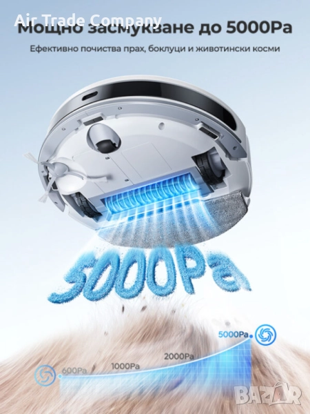 С тънък профил от едва 8,4 см, роботът лесно преминава под ниски мебели като дивани и легла, за да достигне скрития прах. Той предлага разнообразни режими на почистване, включително точково, зиг-заг, случайна траектория и почистване на ръбове, което го прави подходящ за различни видове повърхности и ситуации.